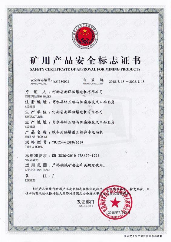 YBJ煤礦井下絞車(chē)用隔爆型三相異步電動(dòng)機(jī)防爆合格證