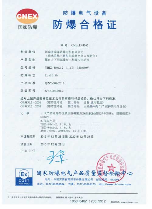 本系列電動(dòng)機(jī)符合 GB755-2008《旋轉(zhuǎn)電機(jī)定額和性能》、企業(yè)標(biāo)準(zhǔn)Q/320206JLAB88-2010《YBK3系列煤礦并下用隔爆硯三相異步電動(dòng)機(jī)技術(shù)條件(機(jī)座號(hào)H100-355)》。其防爆性能符合BG3836.1-2010《爆炸性環(huán)境第1部分:設(shè)備通用要求》和GB3826.2-2010《爆炸性環(huán)境第2部分:由隔爆外殼"d"保護(hù)的設(shè)備》、也符合MT451一l995《煤礦用隔爆型低壓三相異步電動(dòng)機(jī)安全性 能通用技術(shù)規(guī)范》的規(guī)定,制成隔爆科ExdI適用于煤礦井下爆炸性氣體環(huán)境的危險(xiǎn)場(chǎng)所。也符合IEC79-1,BS4683和EN50018的規(guī)定,制成隔爆型。防爆標(biāo)識(shí)為ExdI Mb,使用有爆炸性氣體混合物存在的場(chǎng)所。ExdI Mb適用于煤礦采掘工作面具有甲烷或煤塵的爆炸性混合物存在的工作環(huán)境。