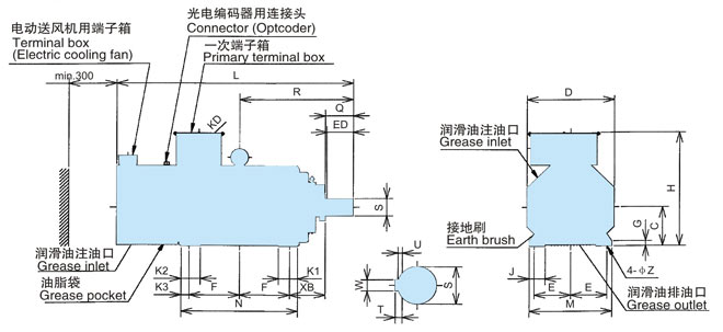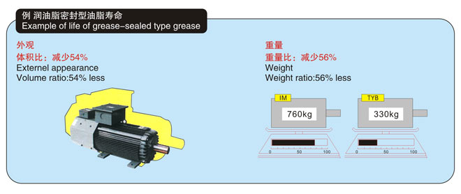 因為轉(zhuǎn)子幾乎不發(fā)生損失,所以軸承溫度較低,密封油脂壽命大約延長至本公司YVF2系列變頻器專用IM的