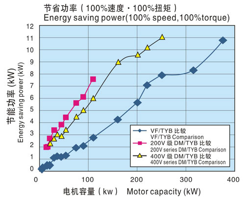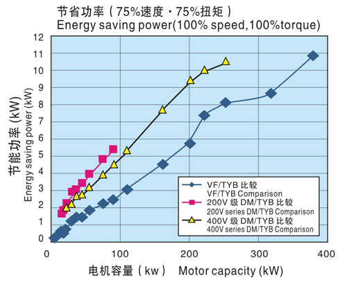 下圖是通過(TYB電機++INV)組合下的綜合效率與(感應(yīng)電機(IM)+INV)、(直流電機(DM)+直流驅(qū)動裝置)的綜合效率之差來表示節(jié)省功率的。