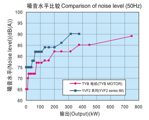 通過降低電機總損失,減少電機冷卻風(fēng)量,實現(xiàn)了比本公司YVF2系列變頻器專用IM更低噪音化。